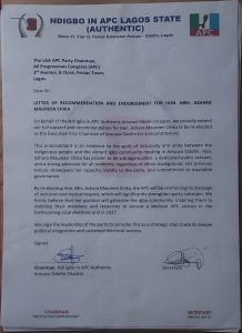 Once again, we boldly ask APC to support Hon. Mrs. Maureen Chika Ashara in her bid for a second term. Her continued service will not only be a personal achievement but a great step forward for our community, our culture, and our shared future.