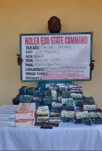 “In Edo state, a white Toyota Hiace bus marked YAB 5522 K coming from Onitsha, Anambra and heading to Isanlu in Kogi was Wednesday,y 6th August intercepted at Ewu junction, Edo by NDLEA operatives who after a search recovered 23, 940 capsules of tramadol, 1,100 tablets of the same opioid and 400 ampoules of pentazocine injection with a suspect Taiye Jethro arrested.