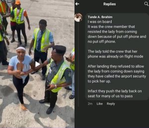 Some passengers on board that aircraft have said that crew members stop comfort emmason from disembarking when they landed in Lagos.