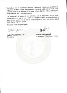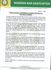 The Nigerian Bar Association strongly condemned the incident, stating that no cultural practice or festival should justify violence or the humiliation of women. The association emphasized that such acts are criminal and must be treated as such.